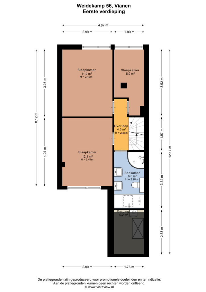 De overloop geeft toegang tot drie slaapkamers van circa 12 m², 12 m² en 6 m². De twee grootste kamers zijn uitstekend geschikt als hoofdslaapkamer, terwijl de derde kamer perfect dienst kan doen als werk-, logeer- of kinderkamer.