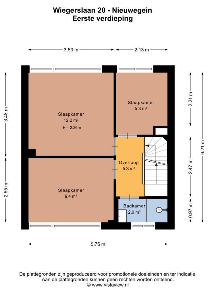 Drie slaapkamers van circa 5,9 en 12 m² groot. De grootste slaapkamer is ruim 12 m² groot en ligt aan de voorzijde van de woning. De twee overige slaapkamers liggen aan de achterzijde van de woning. De badkamer ligt aan de voorkant en is circa 2 m² groot. Er is een douche en wastafel aanwezig. Handig is het dat er een raam aanwezig is, welke ook open kan.
