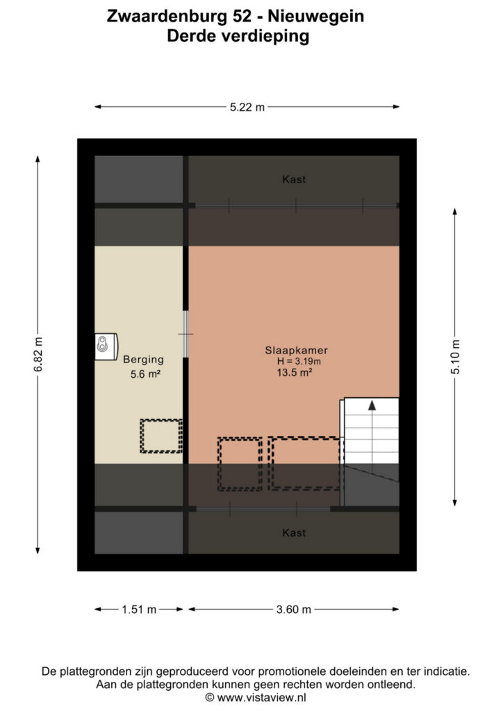 Derde verdieping: ruime kamer van 14 m² met dakramen, aansluitend is er een ruime berging van 6 m². In deze laatste ruimte is de CV-ketel ondergebracht.